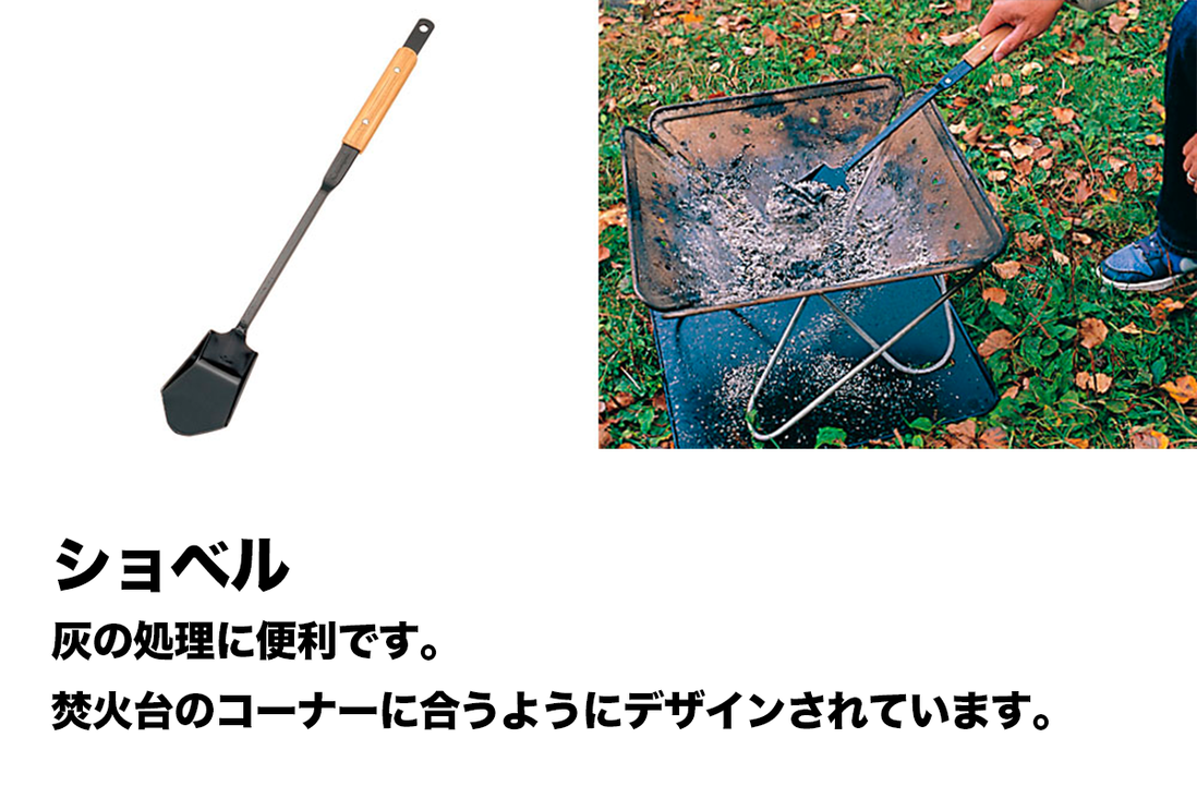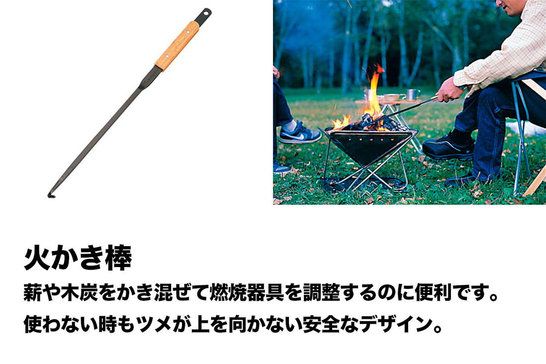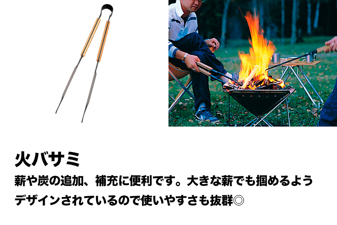 焚火や炭火の火加減を調整したり、灰の処理に便利です。 グリップ部には竹集成材を採用。携帯に便利で丈夫な収納ケースが付属します。 初めて焚き火をする方には特におすすめです。 仕様 【サイズ】 ・組立時(約):全長各520mm ・収納時(約):150×600mm 【重量】 ・1.7kg 【付属品】 ・火ばさみ ・ショベル ・火かき棒 ・収納ケース 【素材】 ・本体:スチール ・グリップ:竹集成材 ・ケース:綿帆布(6号・パラフィン・PU加工) ※注意※ ・ 写真はイメージです。セット内容に記載がある商品のみがレンタルに含まれます ・ レンタル品のご使用は説明書をよく読んでから行ってください ・ 消耗品(電池・ガス缶等)は付属しませんのでご用意ください ・ 新品のレンタルでは御座いませんので、使用に伴う汚れや小キズ等ございます ・ ご購入はお一人様一点限りとさせていただきます。(購入可能な商品の場合) ・ 焚き火台は付属しません。
