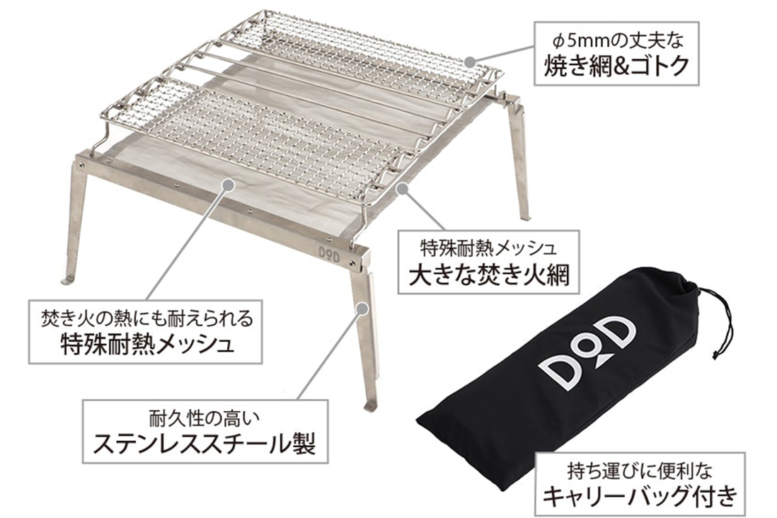 ソロキャンプなら贅沢に、ファミリーキャンプならちょうど良いサイズで使えるBBQグリル&焚火台です。 サイズ調整に伴い設計を一から見直し、組み立てがより簡単な構造を採用しました。 みんなでわいわいBBQをしてから焚き火を楽しみ、最後はコンパクトに収納して素早く撤収。 荷物がかさばらずキャンプをもっと楽しくさせる秘密のアイテムです。 仕様 サイズ:(約)W47×D47×H25cm 収納サイズ:(約)W42×D13×H7.5cm 重量(付属品含む):(約)2.2kg 材質:ステンレス 静止耐荷重:焼き網、ゴトク:3kg ※1枚あたり 焚き火網:5kg 付属品 焼き網×3、ゴトク×1、キャリーバッグ その他特徴 焼き網、ゴトクサイズ:(約)W38×D12cm 焚火網サイズ:(約)W37.5×D35cm ※注意※ ・ 写真はイメージです。セット内容に記載がある商品のみがレンタルに含まれます ・ 炭や薪は同封されませんのでご用意ください ・ テントやタープ内での火気の使用は厳禁です ・ 火の取り扱いには十分にお気をつけください ・ レンタル品のご使用は説明書をよく読んでから行ってください ・ 消耗品(電池・ガス缶等)は付属しませんのでご用意ください ・ 新品のレンタルでは御座いませんので、使用に伴う汚れや小キズ、焚き火臭、草の挿入等ございます